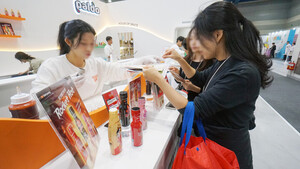 [이뉴스투데이 안경선 기자] 29일 오전 서울 강남구 코엑스에 열린 ‘2025 푸드위크 코리아’에 마련된 ‘하우스 오브 소스 특별관’에서 한 방문객이 삼양식품 관계자에게 시식용 소스를 건네받고 있다.