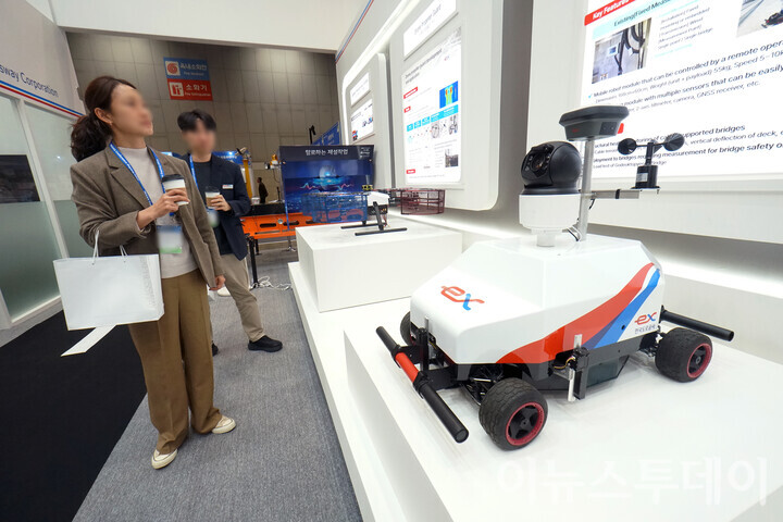 [이뉴스투데이 안경선 기자] 28일 오전 경기 고양시 킨텍스에 열린 ‘2025 국제도로교통박람회’ 한국도로공사 부스에서 방문객들이 교량 유지관리 로봇 ‘센스로버(SensRover)’를 살펴보고 있다.