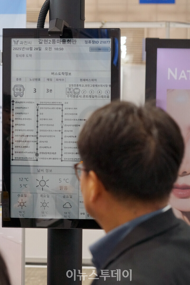[이뉴스투데이 안경선 기자] 28일 오전 경기 고양시 킨텍스에 열린 ‘2025 국제도로교통박람회’에서 한 방문객이 전자종이를 활용한 친환경 에너지 자립형 버스정보안내장치 시스템을 살펴보고 있다.