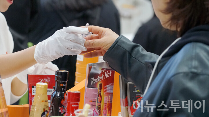 [이뉴스투데이 안경선 기자] 29일 오전 서울 강남구 코엑스에 열린 ‘2025 푸드위크 코리아’에 마련된 ‘하우스 오브 소스 특별관’에서 한 방문객이 삼양식품 관계자에게 시식용 소스를 건네받고 있다.