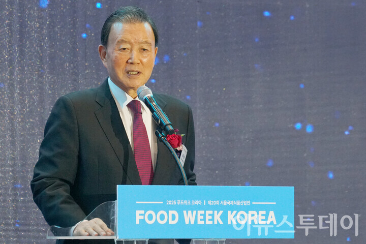 [이뉴스투데이 안경선 기자] 29일 오전 서울 강남구 코엑스에 열린 ‘2025 푸드위크 코리아 개막식’에서 홍문표 한국농수산식품유통공사 사장이 개회사를 하고 있다.