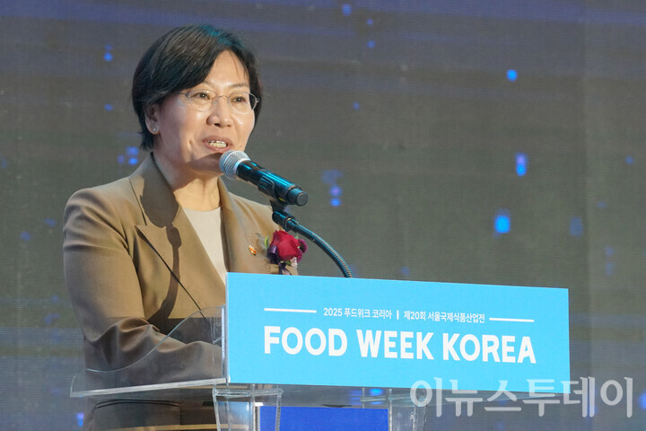 [이뉴스투데이 안경선 기자] 29일 오전 서울 강남구 코엑스에 열린 ‘2025 푸드위크 코리아 개막식’에서 송미령 농림축산식품부 장관이 축사하고 있다.