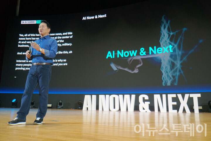 [이뉴스투데이 안경선 기자] 3일 오전 서울 강남구 코엑스에서 열린 ‘SK AI 서밋 2025’에서 최태원 SK 회장이 ‘AI Now & Next’를 주제로 기조연설을 하고 있다.