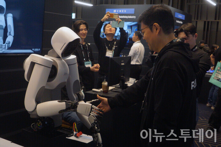[이뉴스투데이 안경선 기자] 3일 오전 서울 강남구 코엑스에서 열린 ‘SK AI 서밋 2025’에서 관계자가 로보틱스 파운데이션 모델(RFM) 리얼덱스(RLDX)를 시연하고 있다.