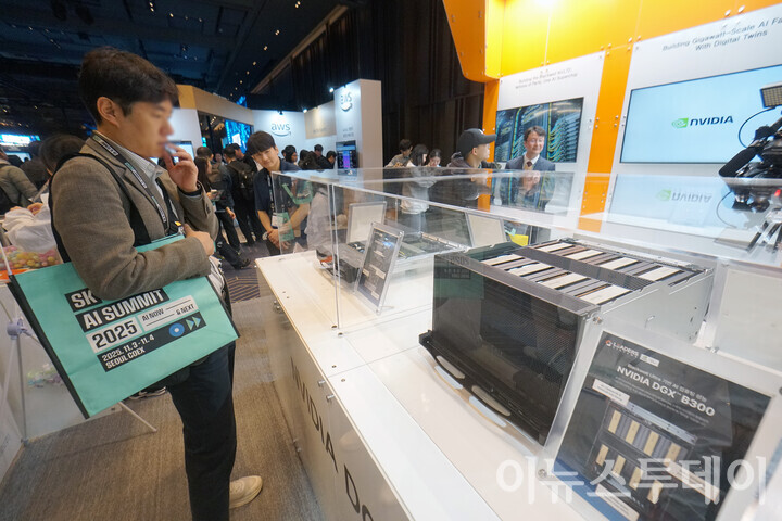 [이뉴스투데이 안경선 기자] 3일 오전 서울 강남구 코엑스에서 열린 ‘SK AI 서밋 2025’ 엔비디아 부스에서 관람객이 전시된 엔비디아 DGX B300을 살펴보고 있다.
