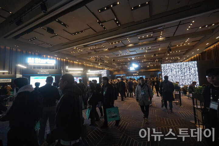 [이뉴스투데이 안경선 기자] 3일 오전 서울 강남구 코엑스에서 열린 ‘SK AI 서밋 2025’ 전시회 섹션에서 관람객들이 참가업체 부스를 둘러보고 있다.