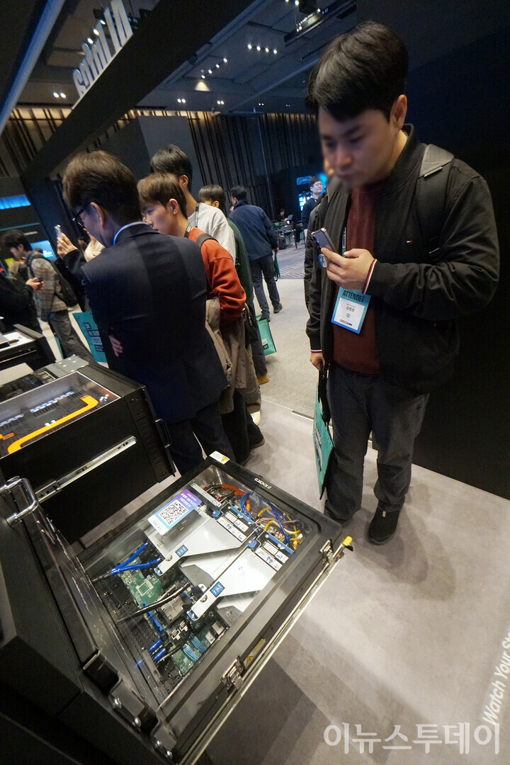 [이뉴스투데이 안경선 기자] 3일 오전 서울 강남구 코엑스에서 열린 ‘SK AI 서밋 2025’ 엔비디아 부스에서 관람객이 AI 기술이 접목된 서버 냉각 시스템을 살펴보고 있다.