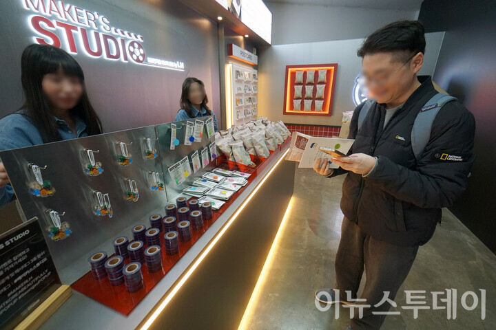 [이뉴스투데이 안경선 기자] 4일 오후 서울 성동구 LH 팝업스토어 ’메이커스 스튜디오(Maker’s Studio)’에서 한 관람객이 라운지에 마련된 기념품을 살펴보고 있다.