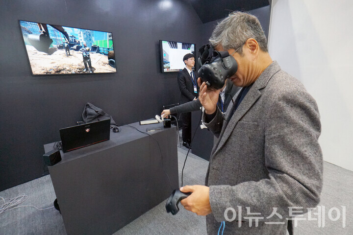 [이뉴스투데이 안경선 기자] 5일 오전 경기 고양시 킨텍스에 열린 ‘2025 스마트건설·안전·AI 엑스포’ 한국도로공사 부스에서 한 방문객이 VR 안전 체험을 하고 있다.