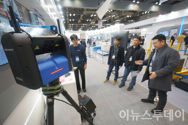 [이뉴스투데이 안경선 기자] 5일 오전 경기 고양시 킨텍스에 열린 ‘2025 스마트건설·안전·AI 엑스포’에서 방문객들이 XR 프로젝터를 살펴보고 있다.