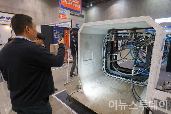 [이뉴스투데이 안경선 기자] 5일 오전 경기 고양시 킨텍스에 열린 ‘2025 스마트건설·안전·AI 엑스포’에서 한 방문객이 비굴착 관거 보강 장비를 휴대폰으로 촬영하고 있다.