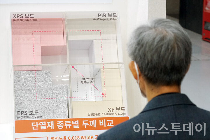 [이뉴스투데이 안경선 기자] 6일 오전 서울 강남구 코엑스에 열린 ‘한국건축산업대전 2025’에서 한 방문객이 두께 비교가 된 단열재들을 살펴보고 있다.