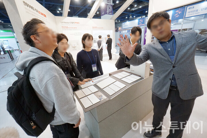 [이뉴스투데이 안경선 기자] 6일 오전 서울 강남구 코엑스에 열린 ‘한국건축산업대전 2025’에 마련된 LX하우시스 부스에서 방문객들이 관계자에게 설명을 듣고 있다.