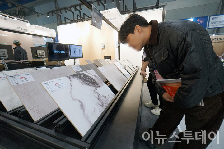 [이뉴스투데이 안경선 기자] 6일 오전 서울 강남구 코엑스에 열린 ‘한국건축산업대전 2025’에서 한 방문객이 불연 벽장재들을 살펴보고 있다.