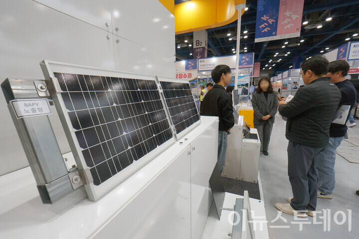 [이뉴스투데이 안경선 기자] 6일 오전 서울 강남구 코엑스에 열린 ‘한국건축산업대전 2025’에서 방문객들이 한 참가업체 부스에서 태양광 장비들을 살펴보고 있다.