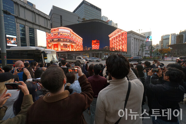 [이뉴스투데이 안경선 기자] 7일 오후 서울 중구 신세계백화점이 본점을 찾은 많은 방문객들이 외벽에 설치된 ‘신세계스퀘어’를 통해 재생되는 ‘시간을 잇는 마법의 세계’ 크리스마스 영상을 휴대폰으로 촬영하고 있다.
