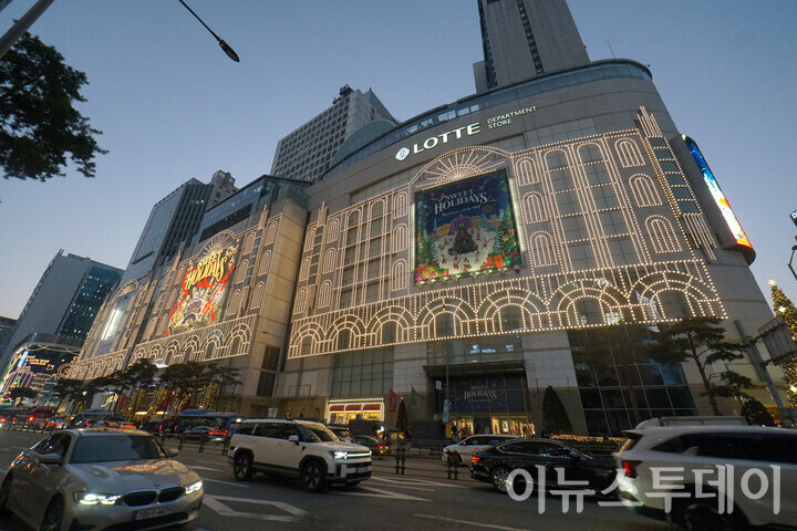 사진은 7일 오후 서울 중구 롯데백화점 본점 외벽에 설치된 ‘롯데타운 크리스마스 파사드’ 모습.