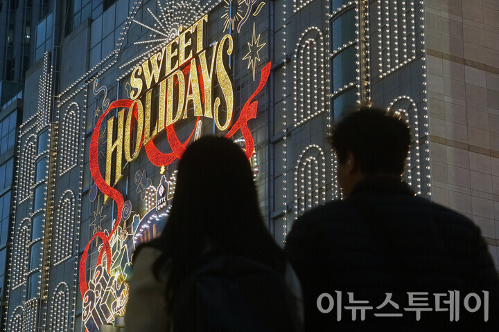 [이뉴스투데이 안경선 기자] 7일 오후 서울 중구 롯데백화점 본점 외벽에 설치된 ‘롯데타운 크리스마스 파사드’가 밝게 빛나고 있다.