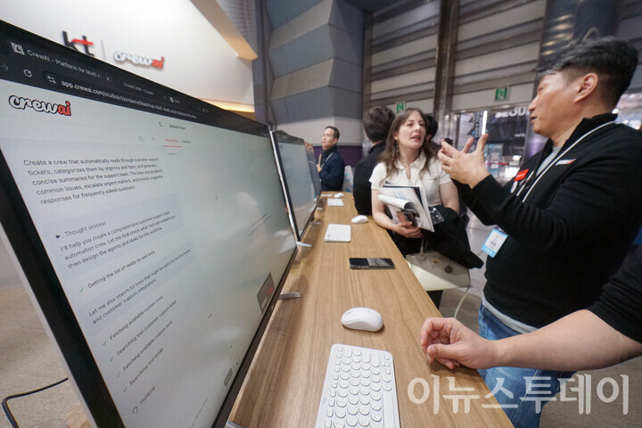 [이뉴스투데이 안경선 기자] 10일 오후 서울 강남구 코엑스에 열린 ‘2025 AI서밋서울앤엑스포’에 마련된 KT 부스에서 한 외국인 방문객이 AI 에이전트 플랫폼 ‘크루 AI’에 대한 설명을 듣고 있다.