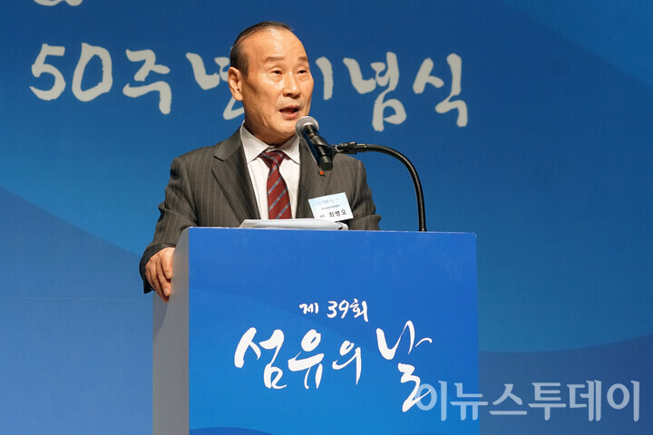 [이뉴스투데이 안경선 기자] 11일 오후 서울 강남구 섬유센터에서 열린 ‘제39회 섬유의 날 기념식’ 행사에서 최병오 한국섬유산업연합회 회장이 기념사를 하고 있다.