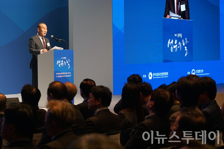 [이뉴스투데이 안경선 기자] 11일 오후 서울 강남구 섬유센터에서 열린 ‘제39회 섬유의 날 기념식’ 행사에서 최병오 한국섬유산업연합회 회장이 기념사를 하고 있다.