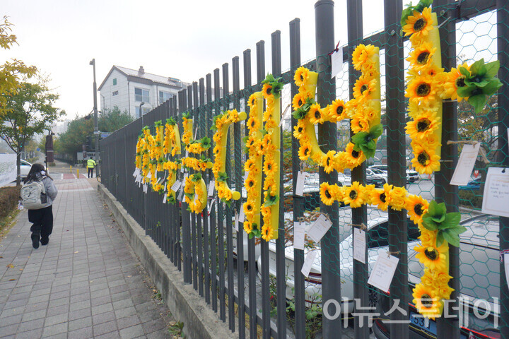 [이뉴스투데이 안경선 기자] 2026학년도 대학수학능력시험일인 13일 오전 경기 화성시 제44지구 제13시험장 서연고등학교 앞 도로에 설치된 응원 메시지 앞을 한 수험생이 지나가고 있다.