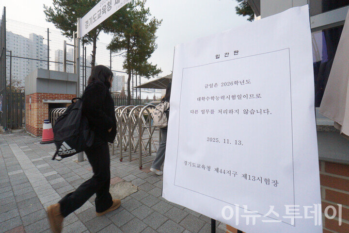 [이뉴스투데이 안경선 기자] 2026학년도 대학수학능력시험일인 13일 오전 경기 화성시 제44지구 제13시험장 서연고등학교에서 한 수험생이 입실을 위해 교문을 지나고 있다.