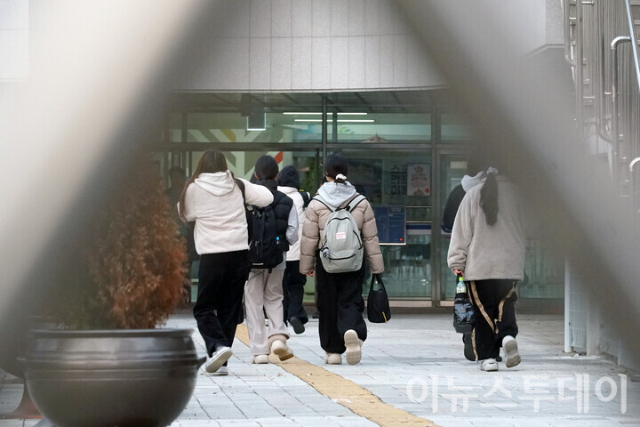 [이뉴스투데이 안경선 기자] 2026학년도 대학수학능력시험일인 13일 오전 경기 화성시 제44지구 제13시험장 서연고등학교에서 수험생들이 입실하고 있다.