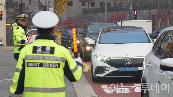 [이뉴스투데이 안경선 기자] 2026학년도 대학수학능력시험일인 13일 오전 경기 화성시 제44지구 제13시험장 서연고등학교 앞에서 자원봉사자들이 수험생 수송차량으로 혼잡한 도로를 정리하고 있다.