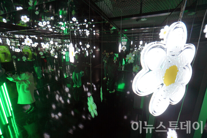 [이뉴스투데이 안경선 기자] 14일 오후 서울 성동구 ‘하나카드 X 지드래곤 팝업스토어’ 엔트리프리미엄 존에서 방문객들이 천장에 매달린 유화 데이지 조형물을 관람하고 있다.