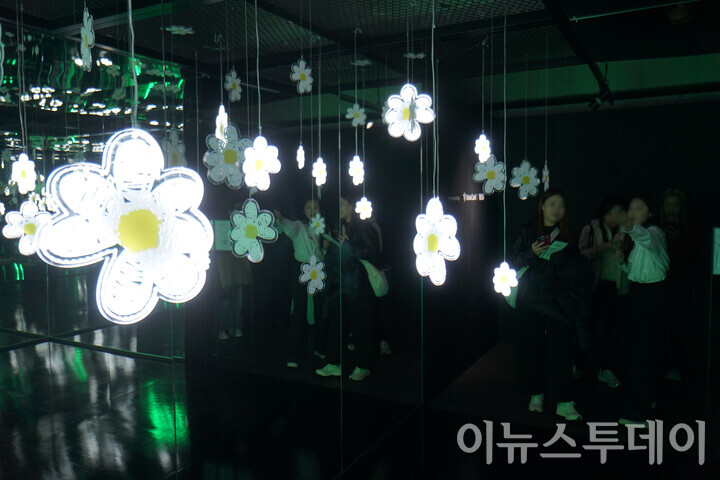 [이뉴스투데이 안경선 기자] 14일 오후 서울 성동구 ‘하나카드 X 지드래곤 팝업스토어’ 엔트리프리미엄 존에서 방문객들이 천장에 매달린 유화 데이지 조형물을 관람하고 있다.