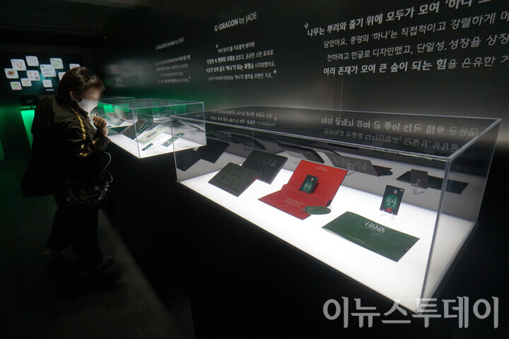 [이뉴스투데이 안경선 기자] 14일 오후 서울 성동구 ‘하나카드 X 지드래곤 팝업스토어’ VVIP프리미엄 존에서 한 방문객이 전시된 ‘지드래곤 체크카드 바이 하나 트래블고(G-Dragon Check by HANA Travlgo)’를 살펴보고 있다.