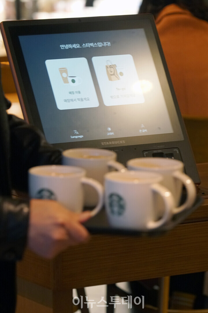 [이뉴스투데이 안경선 기자] 17일 오후 서울 중구 스타벅스 명동길점에서 한 고객이 커피를 든 채 무인 주문기(키오스크) 앞을 지나가고 있다.