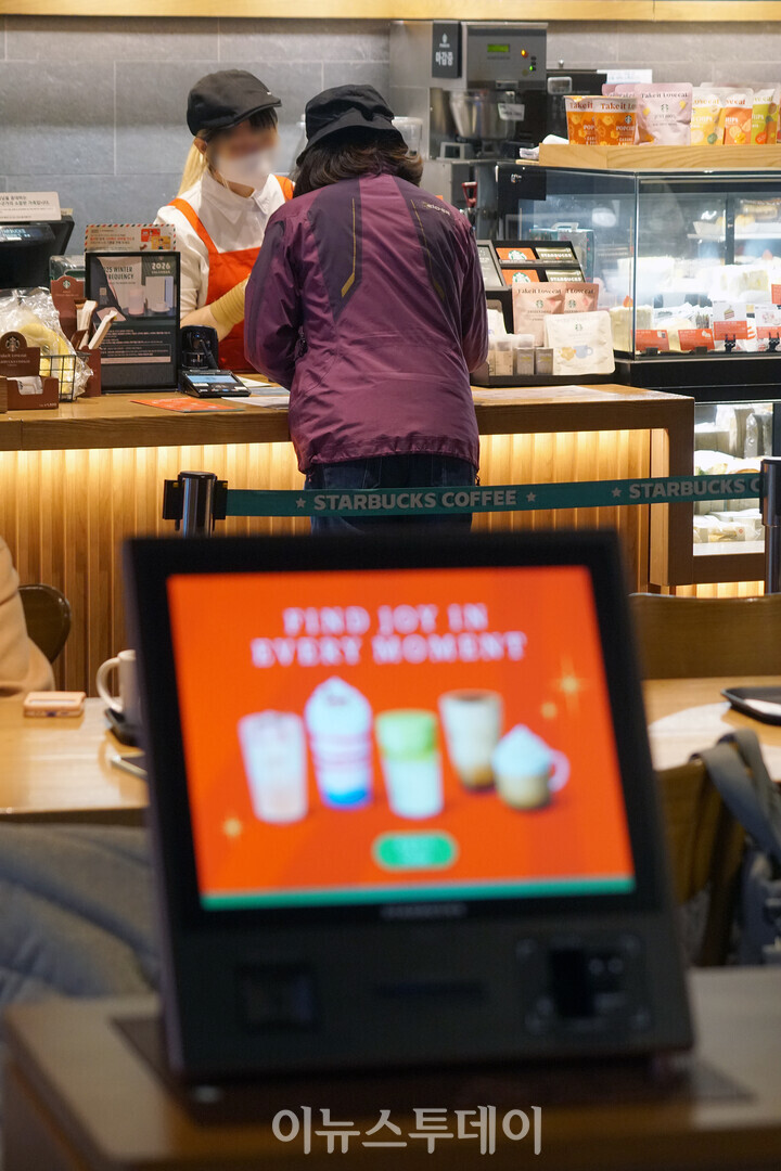 [이뉴스투데이 안경선 기자] 17일 오후 서울 중구 스타벅스 명동길점에 설치된 무인 주문기(키오스크) 뒤로 방문객이 직원에게 음료를 주문하고 있다.