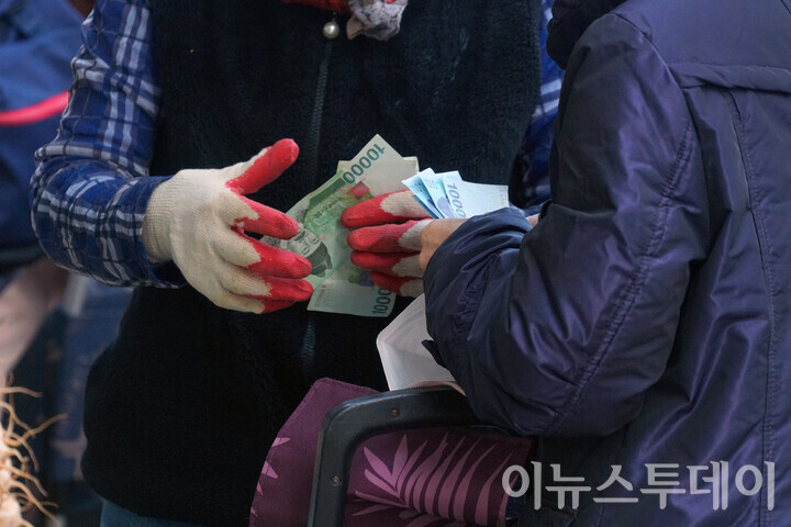 [이뉴스투데이 안경선 기자] 18일 서울 동대문구 청량리종합시장에서 한 시민이 상인에게 돈을 건네고 있다.