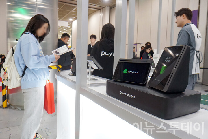 [이뉴스투데이 안경선 기자] 19일 오후 서울 강남구 코엑스에 열린 ‘제24회 서울카페쇼’에서 한 방문객이 네이버페이 오프라인 통합 단말기 ‘N페이 커넥트(NPay Connect)’를 살펴보고 있다.