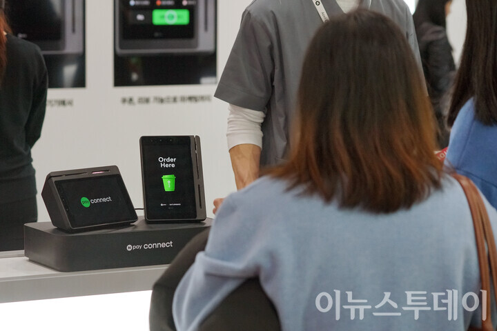 [이뉴스투데이 안경선 기자] 19일 오후 서울 강남구 코엑스에 열린 ‘제24회 서울카페쇼’ 네이버페이 부스에서 한 방문객이 오프라인 통합 단말기 ‘N페이 커넥트(NPay Connect)’를 살펴보고 있다.
