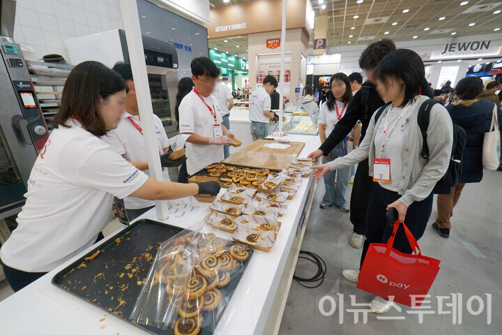 [이뉴스투데이 안경선 기자] 19일 오후 서울 강남구 코엑스에 열린 ‘제24회 서울카페쇼’에서 한 방문객이 삼양사 부스에서 냉동생지 브랜드 ‘프레팡’ 제품을 시식하기 위해 줄을 서고 있다.