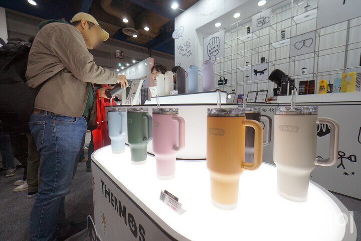 [이뉴스투데이 안경선 기자] 19일 오후 서울 강남구 코엑스에 열린 ‘제24회 서울카페쇼’ 써모스 부스에서 한 방문객이 텀블러를 들고 관계자에게 질문하고 있다.
