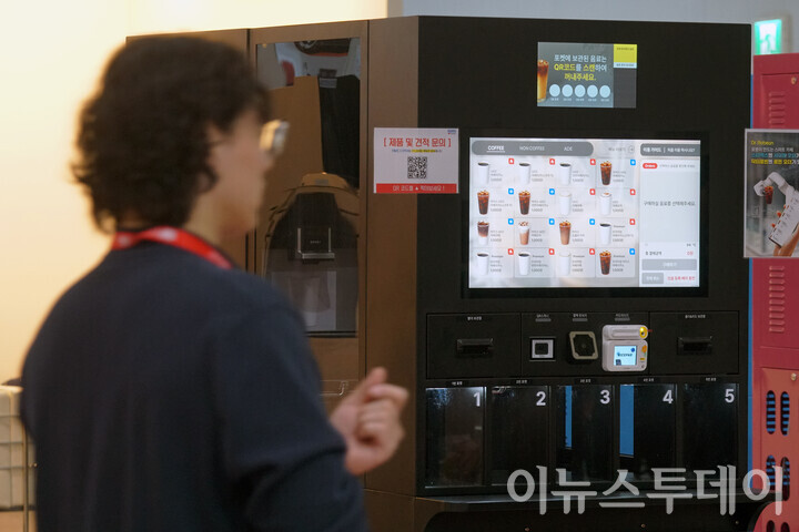 [이뉴스투데이 안경선 기자] 19일 오후 서울 강남구 코엑스에 열린 ‘제24회 서울카페쇼’에서 한 방문객이 전시된 자동 커피머신 앞을 지나가고 있다.