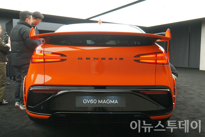 사진은 13일 오전 경기 용인시 제네시스 수지에서 열린 ‘GV60 마그마 미디어 프리뷰’ 행사에 전시된 차량 후면부 모습.