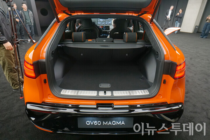사진은 13일 오전 경기 용인시 제네시스 수지에서 열린 ‘GV60 마그마 미디어 프리뷰’ 행사에 전시된 차량 트렁크 모습.