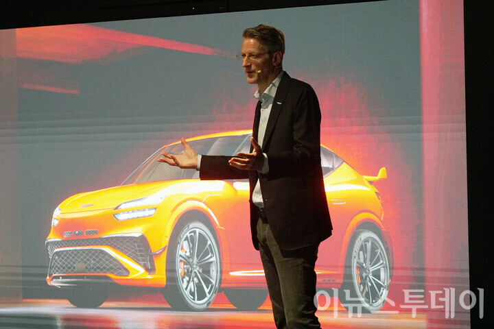 [이뉴스투데이 안경선 기자] 13일 오전 경기 용인시 제네시스 수지에서 열린 ‘제네시스 GV60 마그마 미디어 프리뷰’ 행사에서 틸 바텐베르크 제네시스 커뮤니케이션&PR실 상무가 차량 발표 전 인사말을 하고 있다.
