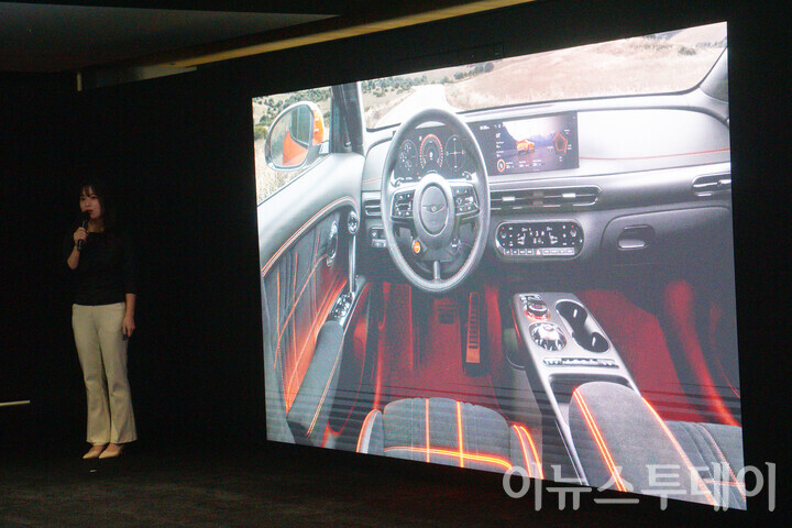 [이뉴스투데이 안경선 기자] 13일 오전 경기 용인시 제네시스 수지에서 열린 ‘제네시스 GV60 마그마 미디어 프리뷰’ 행사에서 관계자가 차량 내장 특징을 설명하고 있다.