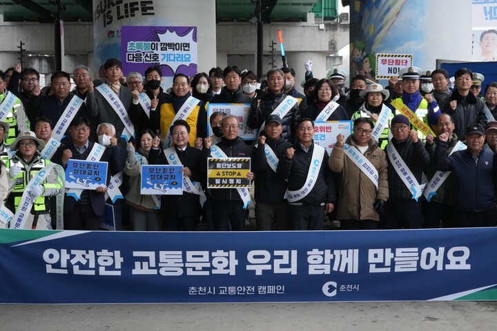 [이뉴스투데이 강원취재본부 김경석 기자] 26일 강원 춘천시 온의교차로 일원에서 육동한 시장을 비롯한 기관 관계자 80여명이 교통안전 캠페인을 진행하고 있다. [사진=춘천시]