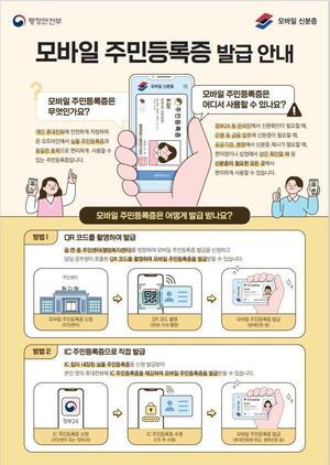 [이뉴스투데이 대전세종취재본부 이윤재 인턴기자] 대전시는 오는 14일부터 ‘모바일 주민등록증’ 발급을 관내 전 지역으로 확대ㆍ시행한다.또한, 3월 28일부터는 주민등록지와 상관없이 전국 어디에서나 모바일 주민등록증을 신청하고 발급받을 수 있도록 추진하며, 희망하는 시민은 ‘QR 발급’ 방식과 ‘직접회로(IC) 주민등록증’ 등을 발급받아 휴대폰에 인식하면 된다.아울러, 실물 주민등록증을 분실신고 하는 경우 모바일 주민등록증의 효력도 자동으로 정지되며, 통신사에 휴대전화나 모바일 주민등록증만을 분실 신고하는 경우에는 모바일 주민등록증의