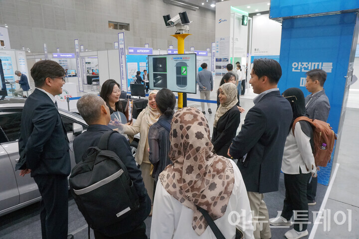[이뉴스투데이 안경선 기자] 30일 오전 경기 수원시 수원컨벤션센터에서 열린 ‘2025 수원 ITS 아태총회’ 전시회에 마련된 지앤티솔루션 부스에서 외국인 방문객들이 인공지능(AI) 기반 영상 분석 시스템 ‘세다(SEDA)’·‘매다(MEDA)’에 대한 설명을 듣고 있다.