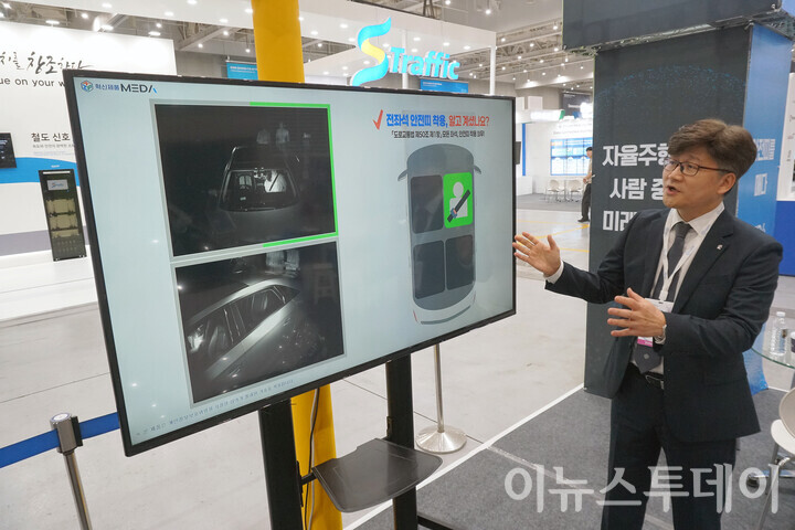 [이뉴스투데이 안경선 기자] 30일 오전 경기 수원시 수원컨벤션센터에서 열린 ‘2025 수원 ITS 아태총회’ 전시회에 마련된 지앤티솔루션 부스에서 강상철 지앤티솔루션 대표가 인공지능(AI) 기반 영상 분석 시스템 ‘세다(SEDA)’·‘매다(MEDA)’에 대한 설명을 하고 있다.