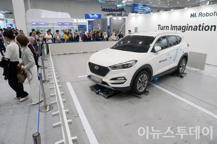[이뉴스투데이 안경선 기자] 30일 오전 경기 수원시 수원컨벤션센터에서 열린 ‘2025 수원 ITS 아태총회’ 전시회에 마련된 HL로보틱스 부스에서 방문객들이 주차로봇 ‘파키’의 시연을 관람하고 있다.